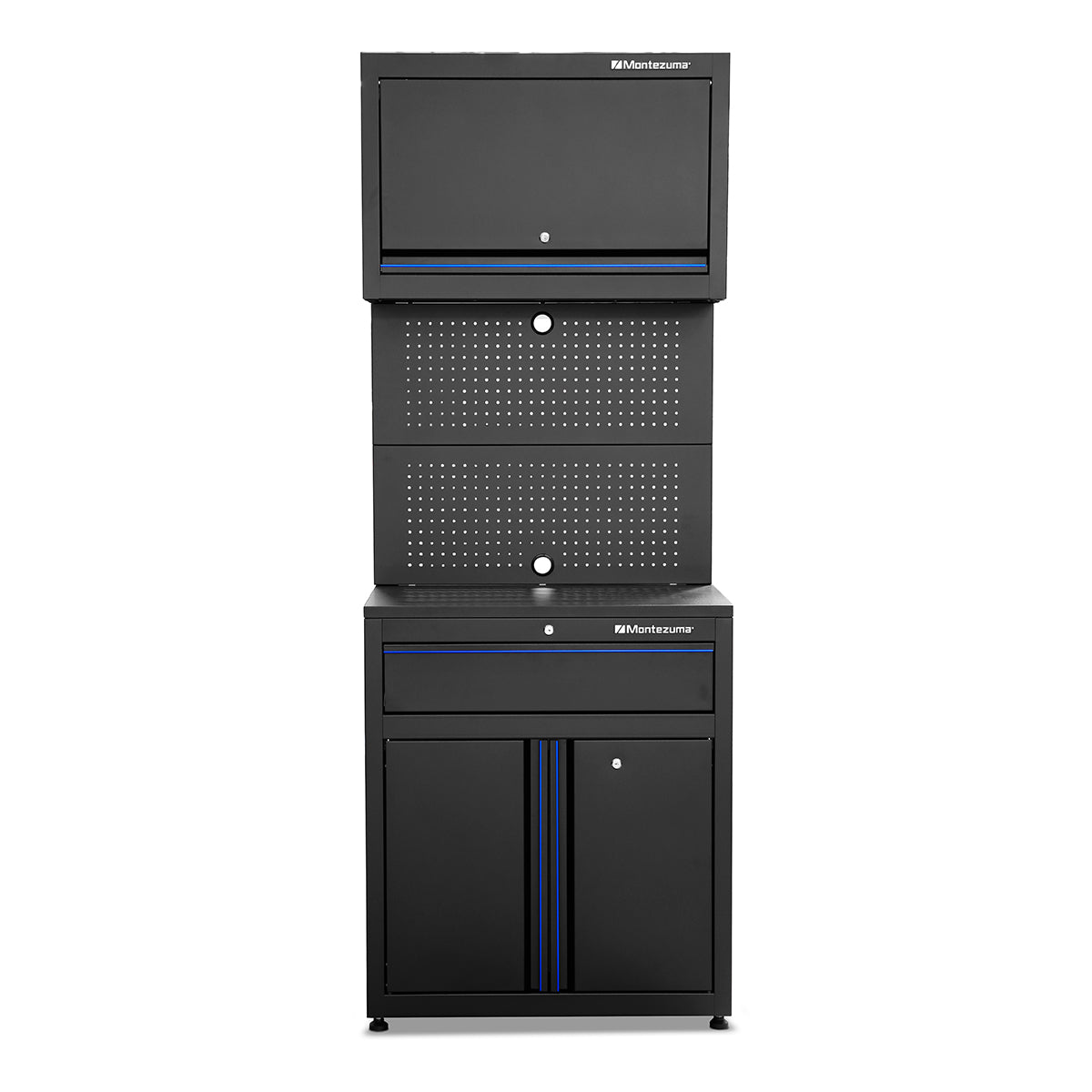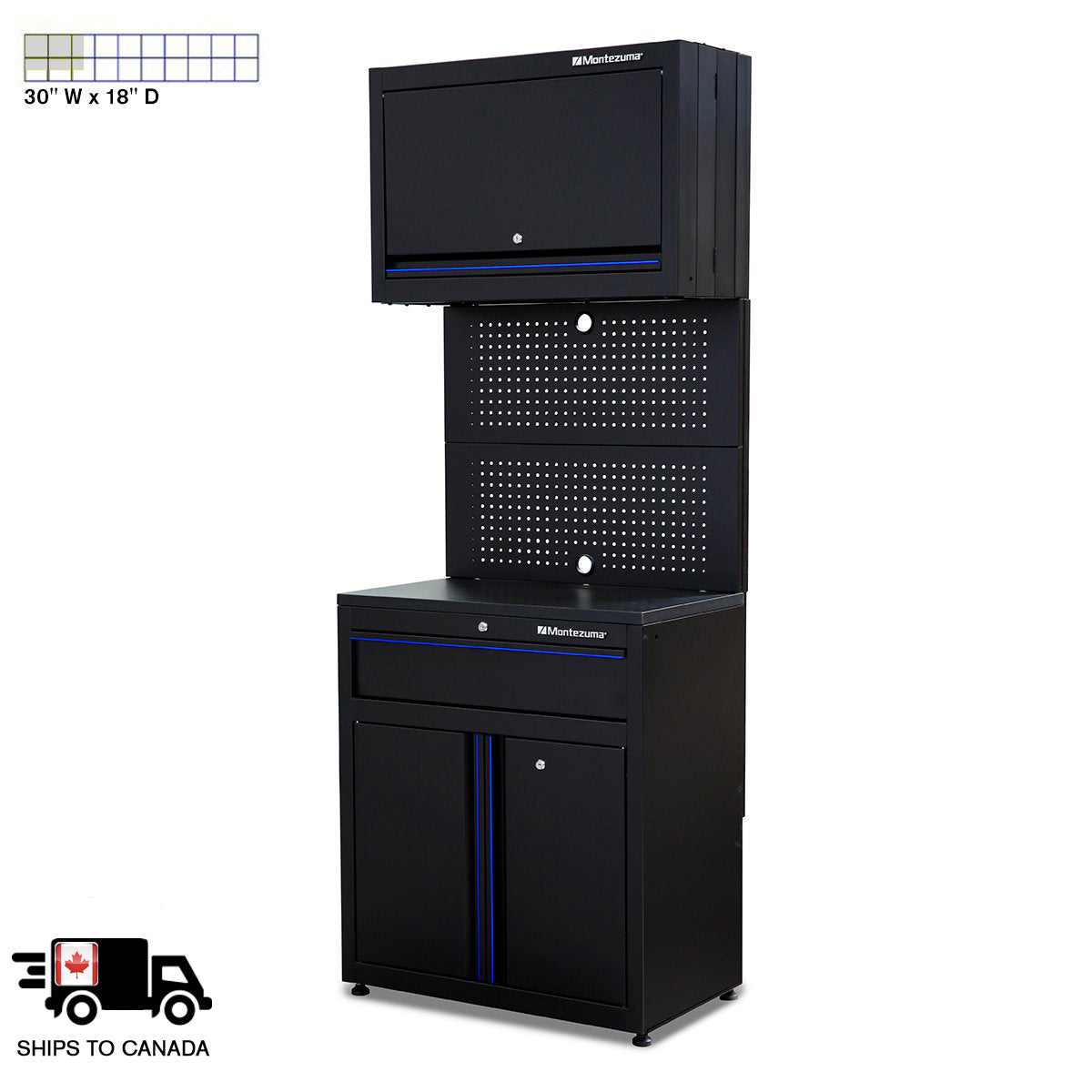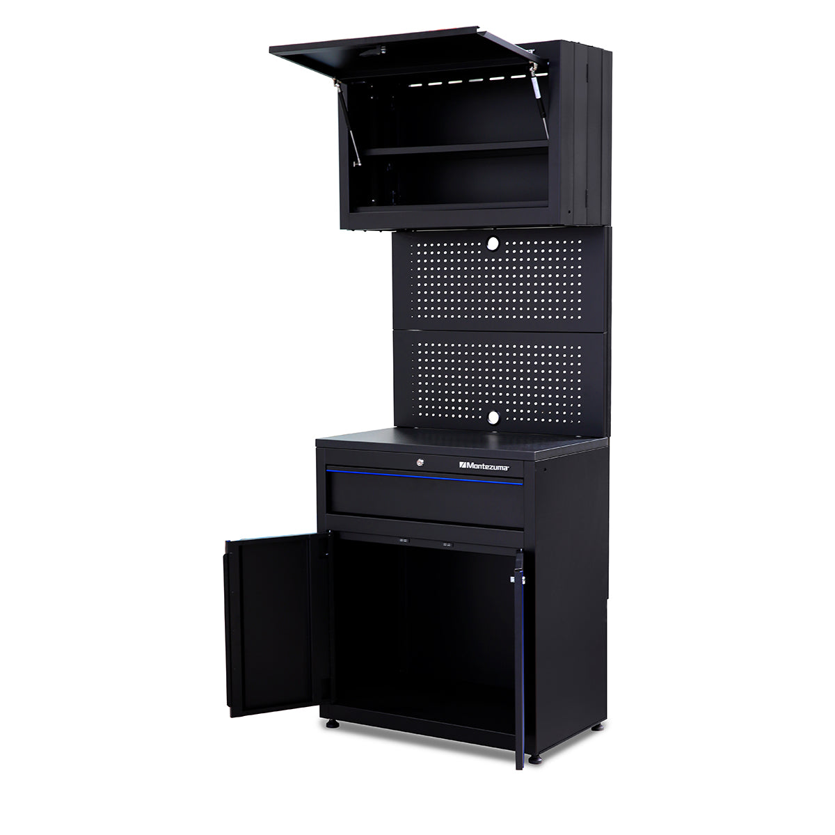 Start building your perfect garage with one click.1-Drawer, 3-Door Workstation; This workstation includes 1 one-drawer, two-door base cabinet with black MDF worktop, 1 one-door wall cabinet and 1 pegboard back wall and posts.