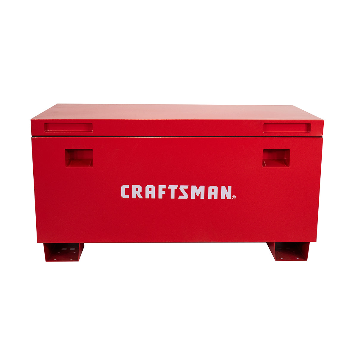 This 45″ Craftsman jobsite box is engineered to handle the harsh conditions of the construction site featuring heavy duty mechanical and gas struts, recessed lock enclosures, large swing up handles, heavy duty gauge steel construction, and forklift rails.