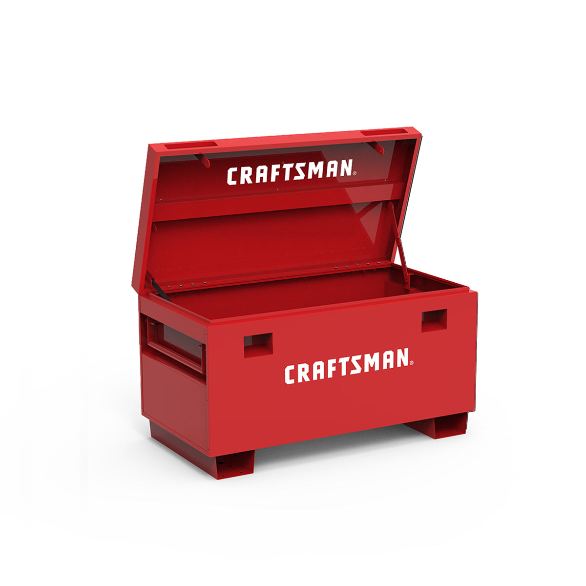 This 45″ Craftsman jobsite box is engineered to handle the harsh conditions of the construction site featuring heavy duty mechanical and gas struts, recessed lock enclosures, large swing up handles, heavy duty gauge steel construction, and forklift rails.