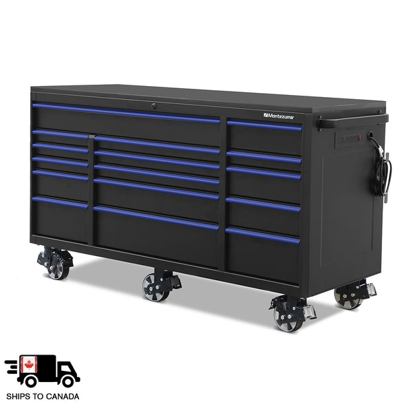 Our new 72 x 30 in. tool cabinet features an exclusive Heavy Duty Raise and Release latching system that keeps drawers tightly closed, while the tubular lock keeps your valuables protected. Full extension ball bearing drawer slides hold up to 250 lb., increasing capacity over comparable tool cabinets and providing a smooth pull action. Power and USB outlets on one side make it quick and easy to charge your power tools and mobile devices. Rugged casters provide easy mobility while supporting the weight. 72 x 30 in. 16-Drawer Tool Cabinet