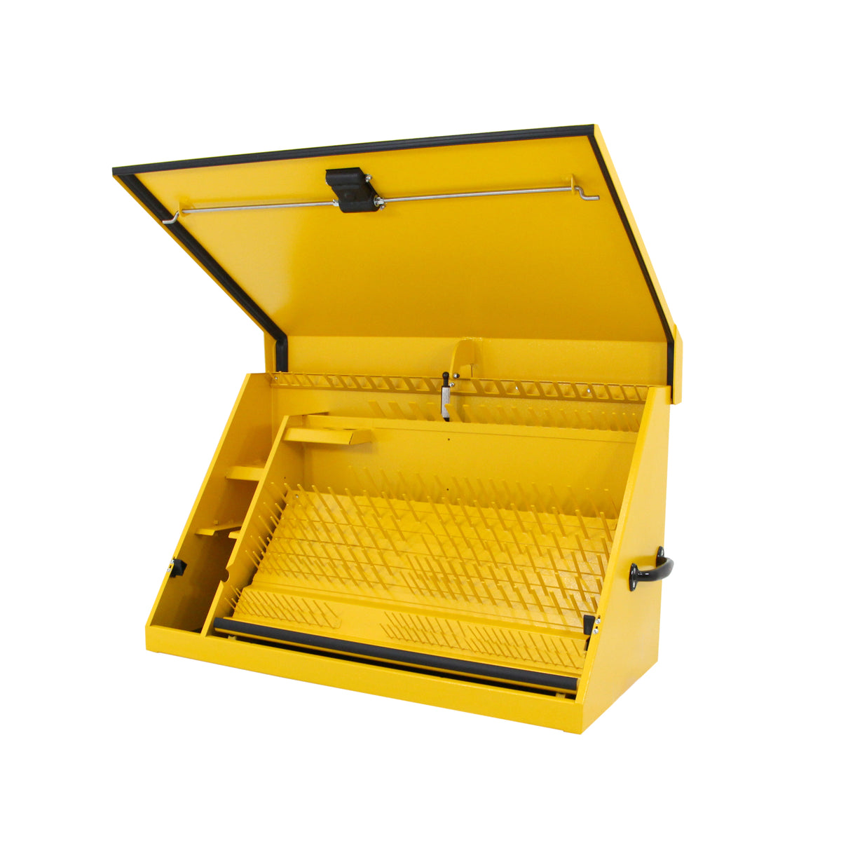DeWalt 36 in. x 17 in. Triangle Toolbox in Yellow:  Introducing the DeWalt 36 x 17 in. Triangle in all Yellow. This multi-tier design toolbox is designed to hold larger tools and supplies while keeping them organized and in one place. With features, such as full height socket pegs for greater flexibility to organize your sockets, tool platform for ratchets, exertions and screwdrivers, convenient slots to store your driver with or without a battery and much more, it is ready for any job. The Triangle is constructed of steel with a yellow finish.
