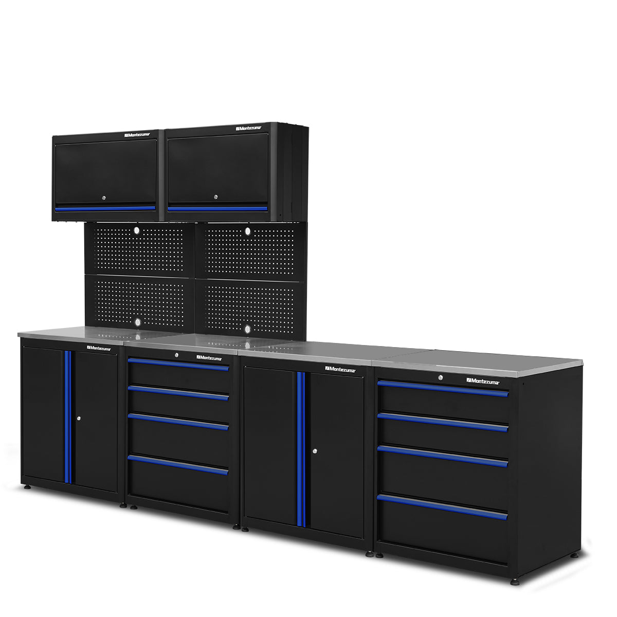 Build your perfect garage with one click. This combo combines 2 four-drawer base cabinets with stainless steel worktop, 2 two-door base cabinets with stainless steel worktop, 2 one-door wall cabinets, and 2 pegboard back walls and posts Premium 8-Piece Combo – Set 2